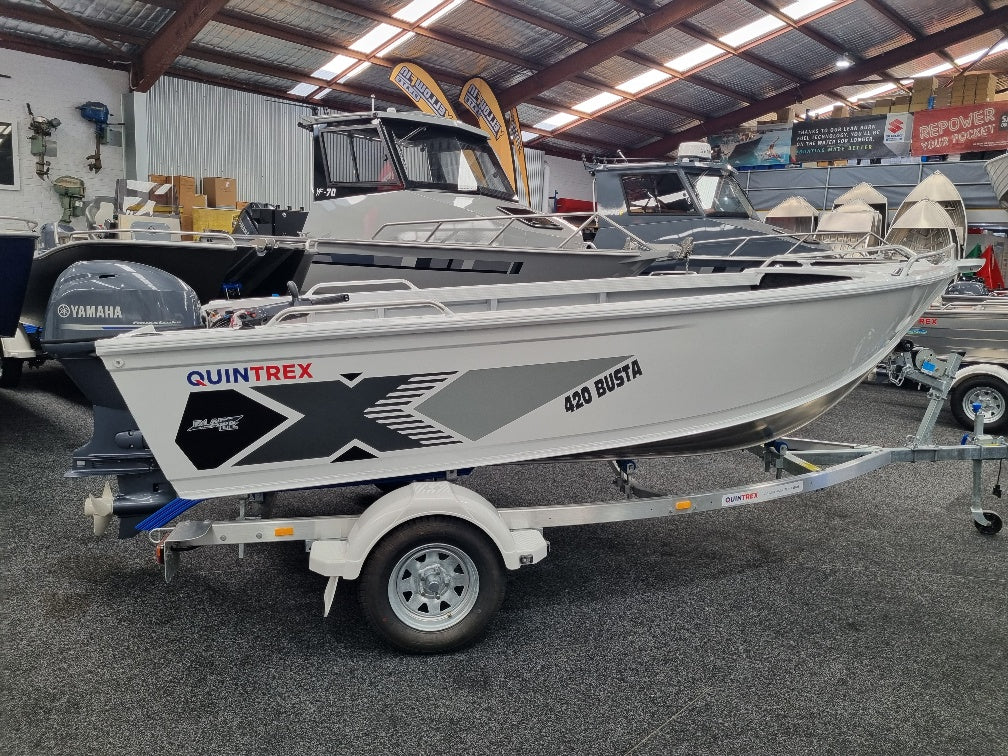Quintrex 420 Busta powered by a Yamaha 40hp 4 stroke with trim and tilt and electric start all fitted on the Quintrex alloy trailer. One of our most popular packages. Options fitted and included are: