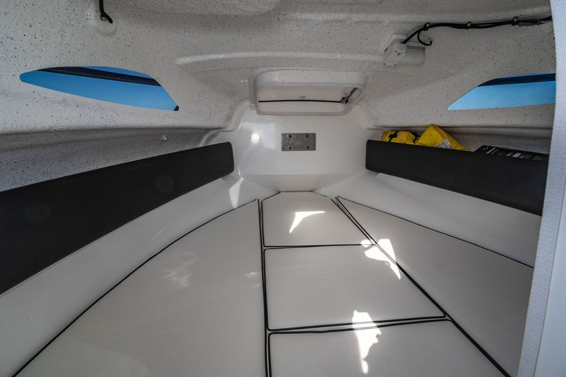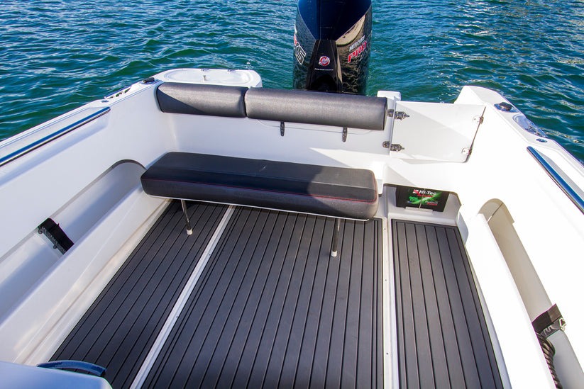 Key features include a massive open deck area, open half cab with bunk cushions and storage underneath, extra-wide side pockets for rods and other gear, split dash with walkthrough windscreen to access the anchor, helm console with room for gauges, controls and other electronics (up to 12 inches) and a 100L fuel tank.