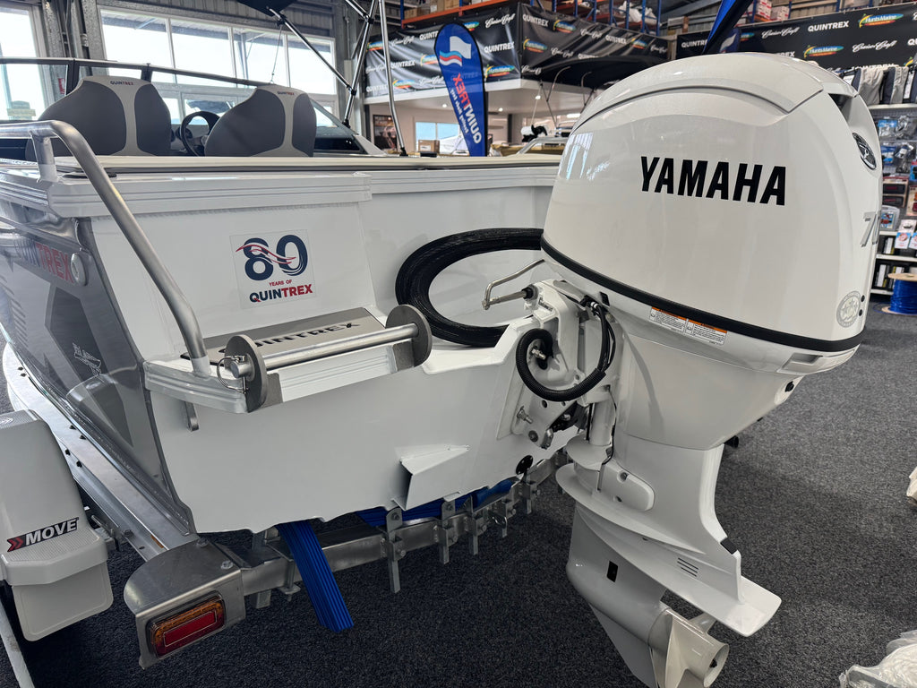Quintrex 450 Fishabout Powered by a Yamaha 70hp pearlescent white four stroke outboard motor, fitted to a Quintrex Aluminium trailer