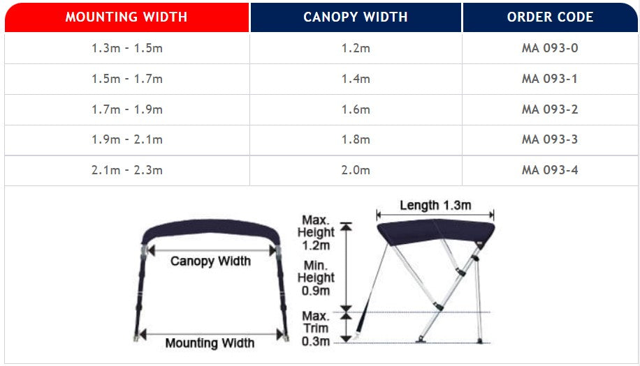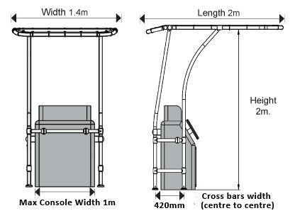 With a height (head clearance to deck) of 1260mm they are available in 3 sizes to suit different different deck widths. The Small suits deck widths of 1600mm to 1800mm and is 1500mm wide at the top internally between the grab handles, the Medium suits 1800mm to 2000mm and is 1700 wide at the top and the Large suits 2000mm to 2200mm and is 1900mm wide at the top. See additional pictures for full dimensions.