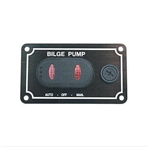 Horizontal black aluminium bilge pump switch panel with built in fuse and LED indicator lights in the rocker switch. It has a 3 position switch for auto mode, off and manual on. Dimensions are 85mm X 50mm by 50mm required depth.