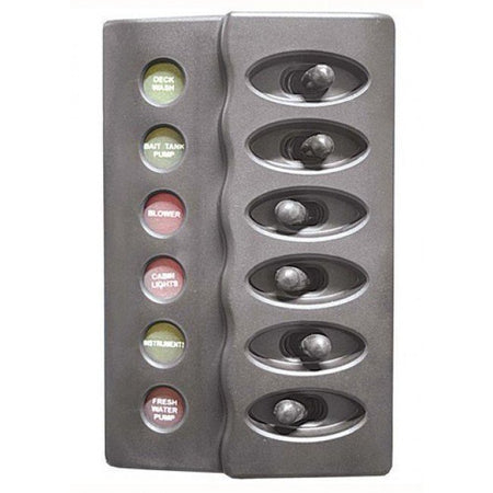 Able to be mounted Horizontally or Vertically, these waterproof Switch Panels are quality CE certified and come in either 4 and 6 gang with a snap-on matt black facia and waterproof booted switches. They comes with 15amp blade type fuses which are behind a rubber sealed section to keep them water tight and the LED indicator lights turn red or green depending on if the switch is on or off. (As per picture) Suitable for 12 volt only. Height = 108mm, Width = 98mm for the 4 gang and the 6 gang is 152mm high by 98mm wide. Both have a depth of 75mm. Supplied with 30 assorted stick-on name labels.
