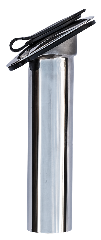 Single stainless steel rod holder that fits into any 30 degree deck mount rod holder. Has a movable nylon tapered spacer for a secure fit and cross cut in the bottom to engage in any rod stop.