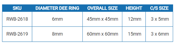 Made from 304 stainless steel they have a 2 piece body and dee ring that folds down and is only 14mm high when not in use. The overall dimensions of both are 65mm by 50mm and you can have either a 6mm by 40mm dee ring or a 8mm by 40mm dee ring.
