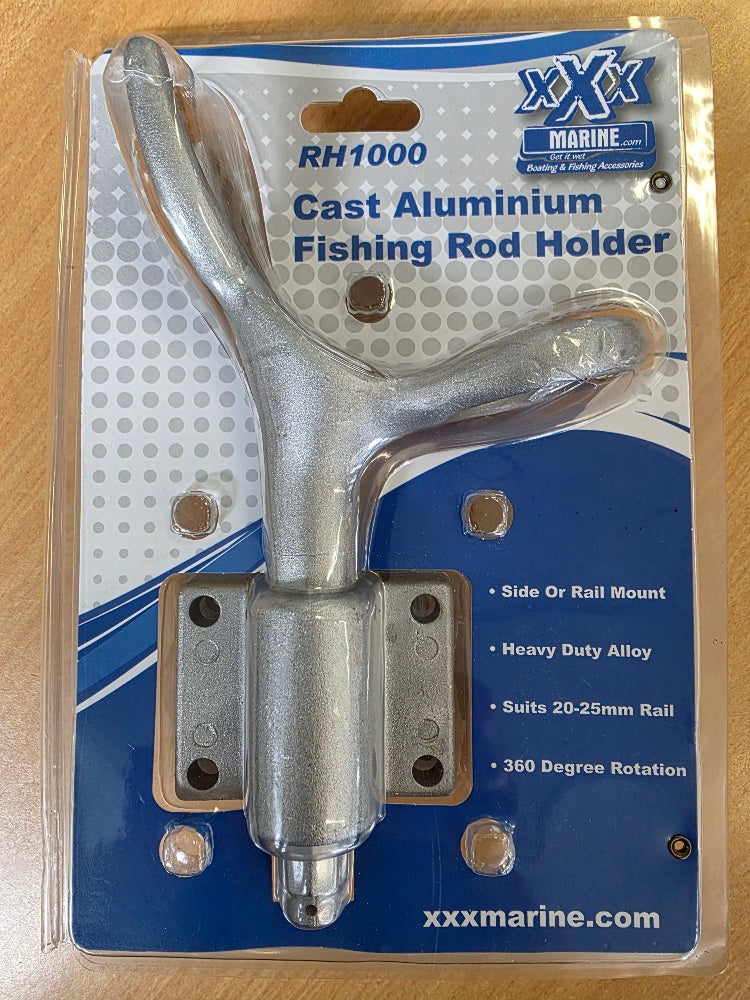 This cast alloy rod holder has been around forever and is a popular product that just works well and lasts forever. It can be side or rail mounted and suits rails 20-25mm. It comes with the backing plate and 4 bolts. It rotates 360 degrees and not only does it lock in position you can fit a small R clip or tether through the base so there is no chance anyone will drop it over the edge.