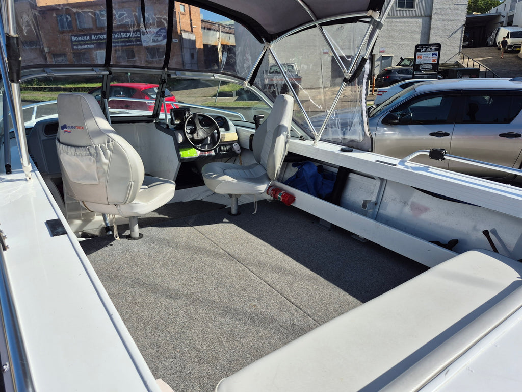 WHAT A GREAT LITTLE TINNY!! 1994 Quintrex 370 powered by a Suzuki 15hp 2 stroke all fitted on a Brooker gal steel trailer with spare wheel. This boat has just had a full service on the motor and trailer with new bearings, LED tail lights, wheels and tyres fitted. So nothing to spend. Boat cover included. All of our used boats are thoroughly checked before trade in and we service the motor and trailer before purchase. A 3 month warranty is included with all our used boats. Enclosed waters safety gear and balance of registrations included. Guaranteed title. This boat is on display at our Sydney store.
