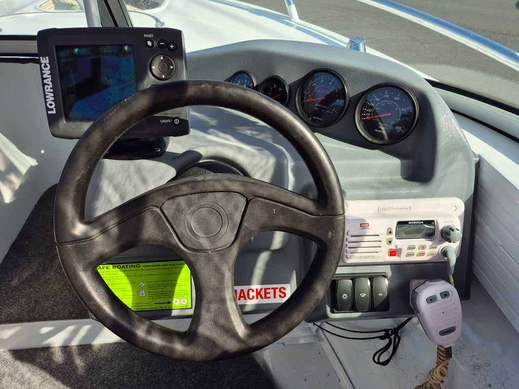 VERY TIDY RUNABOUT, SUZUKI 70HP 4 STROKE 2015 Quintrex 481 Fishabout powered by a Suzuki 70hp 4 stroke outboard motor with only 150 hours use all fitted on a Telwater alloy trailer with spare wheel. Features include Bimini, Front and side clears, Travel cover, Rocket launcher, Lowrance Elite 5x Fishfinder, GME VHF Marine radio, Bait cutting board, Rod holders, Bilge pump, Navigation lights, Battery isolation switch, Rear boarding ladder. All of our used boats are thoroughly checked before trade in and we service the motor and trailer before purchase. A 3 month warranty is included with all our used boats. Enclosed waters safety gear and balance of registrations included. Guaranteed title. This boat is on display at our Sydney store.