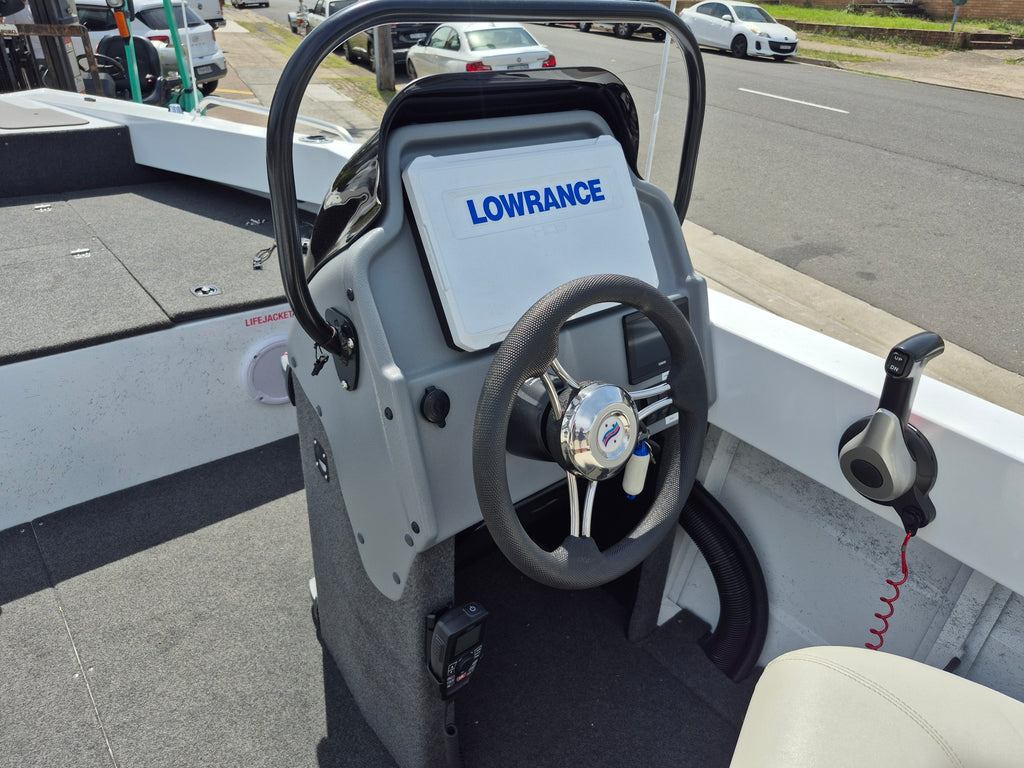 FULLY OPTIONED. YAMAHA 130HP 4 STROKE LOW HOURS 2022 Quintrex 530 Frontier Side Console powered by a Yamaha 13hp 4 stroke with only 91 hours use all fitted on a Telwater alloy trailer with spare wheel, Catch and release. Features include Lowrance HDS 12 Combo, Lowrance sound system, Yamaha CL5 Multi-function gauge, Plumbed live well, Plumbed live bait tank, GME GX750 VHF Marine radio, Rods locker, Console rod storage, Transom door, Hydraulic steering, Cockpit lights, Custom made all over cover, Stainless steel rod holders, Stainless steel ski pole with Bait cutting board, Console grab rail, USB charging port, Yamaha cowl cover, Dual batteries with switch, Bilge pump, Navigation lights, Minn Kota 80lb I- pilot with Remote, foot pedal and Heading sensor, Hard wired battery charger. All of our used boats are thoroughly checked before trade in and we service the motor and trailer before purchase. A 3 month warranty is included with all our used boats. Enclosed waters safety gear and balance of registrations included. Guaranteed title. This boat is on display at our Sydney store.