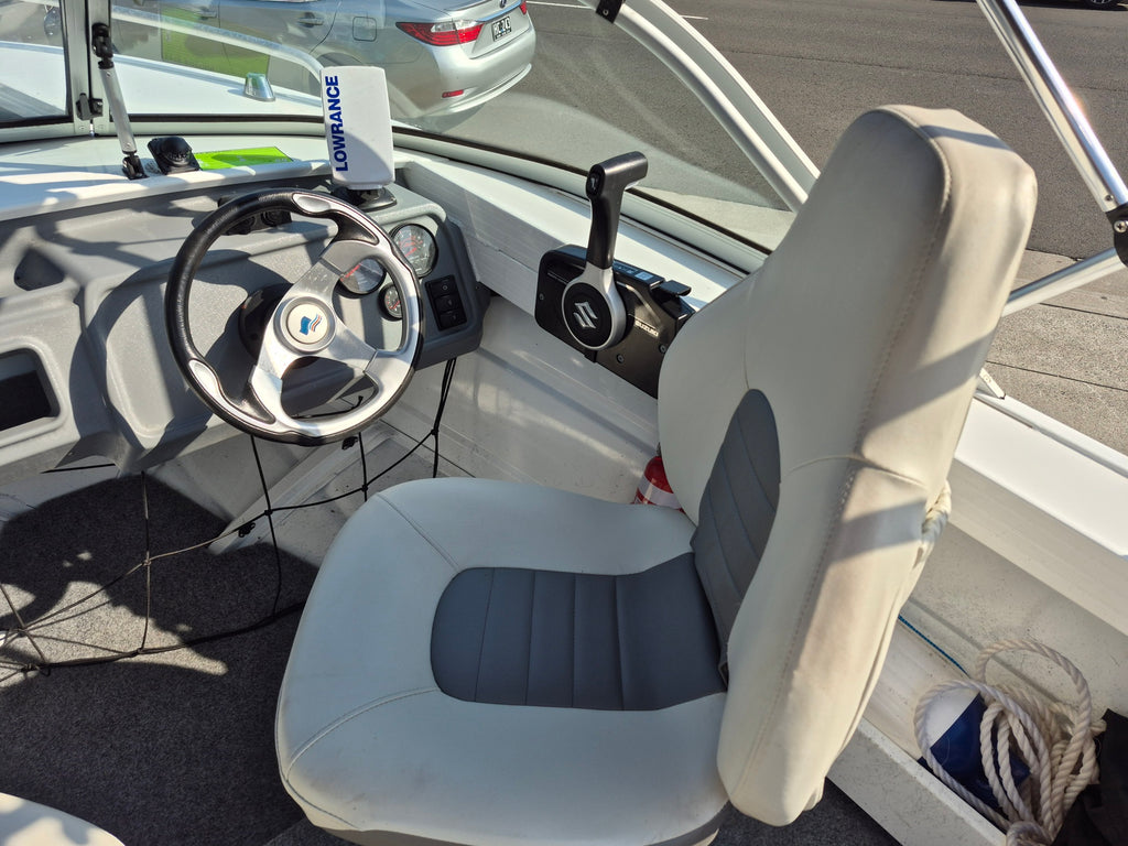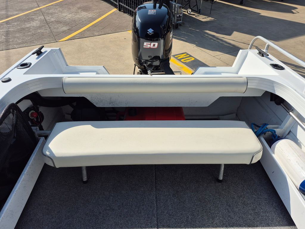 AFFORDABLE RUNABOUT. SUZUKI 50HP 4 STROKE 2018 Quintrex 430 Fishabout runabout powered by a Suzuki 50hp 4 stroke with 60 hours use all fitted on a Telwater alloy trailer with spare wheel. Features include Bimini with envelope, Lowrance Fishfinder, 12 volt USB outlet, Compass, Navigation lights, Cup holders, Rod holders, Cargo netting under dash, Battery isolation switch, Bilge pump All of our used boats are thoroughly checked before trade in and we service the motor and trailer before purchase. A 3 month warranty is included with all our used boats. Enclosed waters safety gear and balance of registrations included. Guaranteed title. This boat is on display at our Sydney store.