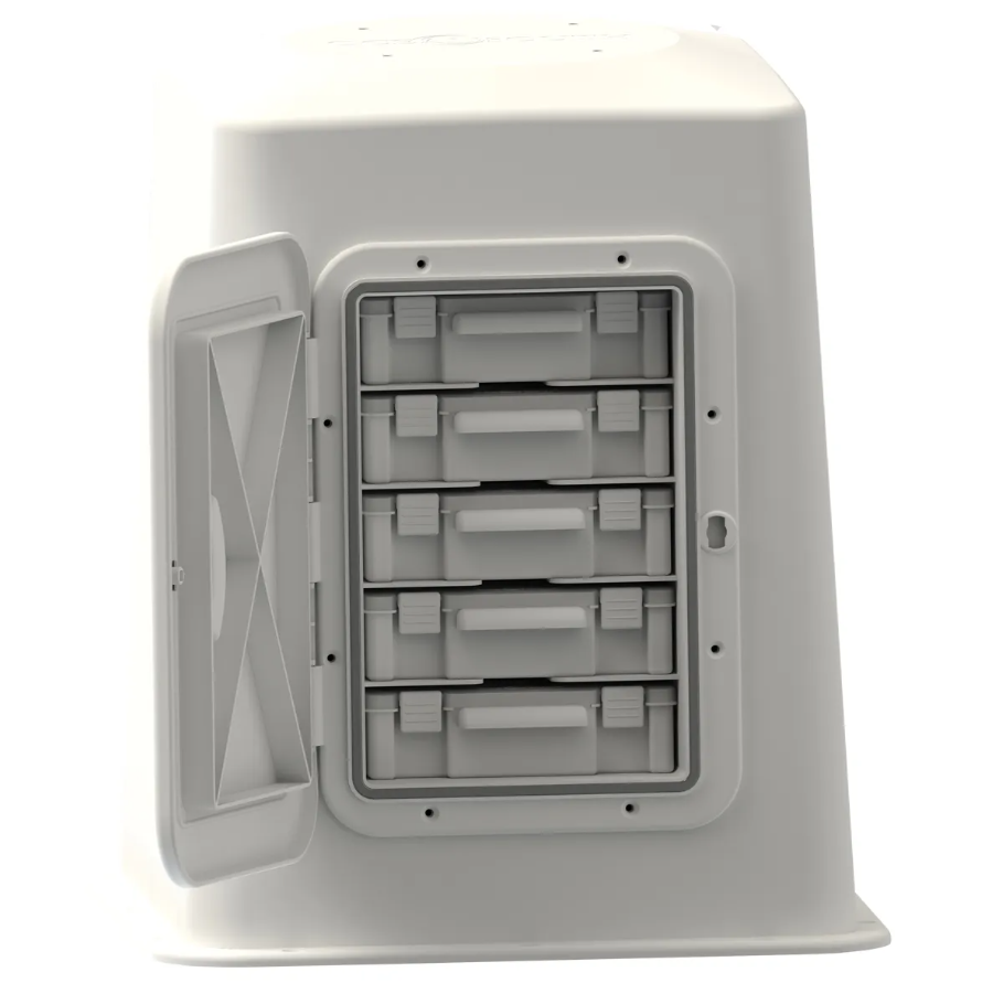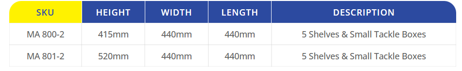 These are the same 2 seat bases as above except instead of just the access hatch they have a tackle storage compartment. Inside, the water-proof storage box is equipped with five removable horizontally stacked tackle boxes. Each tackle box measures 235mm (L) × 185mm (W) × 50mm (H) and features a clear hinged lid for quick visibility and access. Each box contains 12 compartments with removable dividers, allowing you to customise the storage space to suit your gear – perfect for organising fishing lures, hooks, sinkers, swivels and other tackle items.