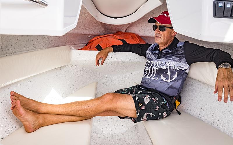 Key features include a massive open deck area, open half cab with bunk cushions and storage underneath, extra-wide side pockets for rods and other gear, split dash with walkthrough windscreen to access the anchor, helm console with room for gauges, controls and other electronics (up to 12 inches) and a 100L fuel tank.