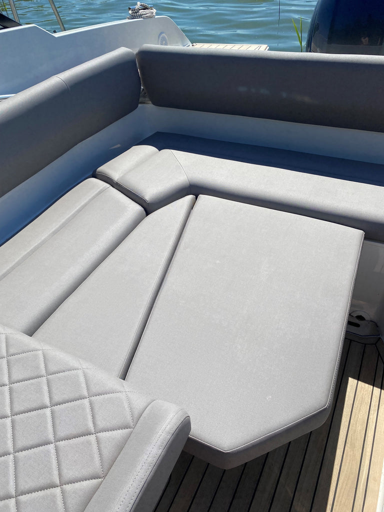 Beneath the swimming platform on the left side is stowage space for mooringlines and the anchor. On the starboard side, the fuel filler cap and fuel filter can be found under the deck. The wide swimming platforms on the aft deck on both sides of the outboard motor serve as access routes from the dock, as well as practical casting places for anglers. The entire deck and all walkways are covered with a stylish Softdeck non-slip deck material that comes as standard.